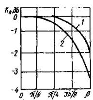 Коэффициент передачи ТДЛ зависит от того, насколько волновое сопротивление отлично от оптимального значения и каково при этом соотношение электрической длины линии и длины волны. Если, например, с отличается от требуемого в два раза, то потери в ТДЛ равны 0,45 дБ при длине линии лямбда/8 и 2,6 дБ при лямбда/4. На рис. 7 приведена зависимость коэффициента передачи ТДЛ с n=2 от фазовой длины его линий для трех значений g.