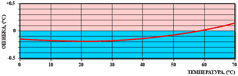 С помощью дополнительных вычислений дискретность представления температуры можно уменьшить, в нашем случае она равна 0.1°C. Самым привлекательным является то, что такой термометр уже откалиброван на заводе, гарантированная точность составляет ±0.5°C в диапазоне –10..+85°C и ±2°C во всем диапазоне рабочих температур. Типичная кривая ошибки измерения температуры приведена на рис