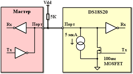 Вначале рассмотрим аппаратную конфигурацию. 1-проводная шина является двунаправленной. На рис. 4 показана аппаратная конфигурация интерфейсной части DS18S20 и мастера шины. У каждого 1-проводного устройства к шине подключен вход приемника и выход передатчика с открытым стоком. Открытый сток позволяет подключать к шине множество устройств, обеспечивая логику «монтажное или». Генератор тока 5мкА обеспечивает на входе 1-проводного устройства низкий логический уровень, когда шина не подключена. Так как линия тактового сигнала отсутствует, обмен является синхронным. Это означает, что в процессе обмена нужно достаточно точно выдерживать требуемые временные соотношения.