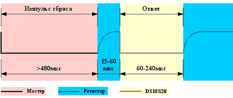 Мастер посылает импульс сброса (resetpulse) - сигнал низкого уровня длительностью не менее 480 мкс.