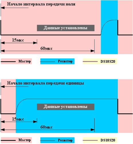 Ответ подчиненного устройства даёт мастеру понять, что на шине присутствует термометр и он готов к обмену. После того, как мастер обнаружил ответ, он может передать термометру одну из команд. Передача ведётся путём формирования мастером специальных временных интервалов (timeslots). Каждый временной интервал служит для передачи одного бита. Первым передаётся младший бит. Интервал начинается импульсом низкого уровня, длительность которого лежит в пределах 1 - 15 мкс. Поскольку переход из единицы в ноль менее чувствителен к ёмкости шины (он формируется открытым транзистором, в то время как переход из ноля в единицу формируется подтягивающим резистором), именно этот переход используют 1-проводные устройства для синхронизации с мастером. В подчиненном устройстве запускается схема временной задержки, которая определяет момент считывания данных. Номинальное значение задержки равно 30 мкс, однако, оно может колебаться в пределах 15 - 60 мкс. За импульсом низкого уровня следует передаваемый бит. Он должен удерживаться мастером на шине в течение 60 - 120 мкс от начала интервала. Временной интервал завершается переводом шины в состояние высокого уровня на время не менее 1 мкс. Нужно отметить, что ограничение на это время сверху не накладывается. Аналогичным образом формируются временные интервалы для всех передаваемых битов