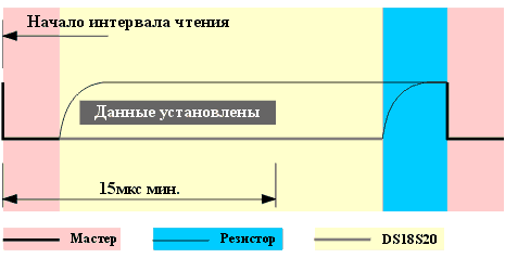 При приеме данных от подчиненного устройства временные интервалы для принимаемых битов тоже формирует мастер. Интервал начинается импульсом низкого уровня длительностью 1 - 15 мкс. Затем мастер должен освободить шину, чтобы дать возможность термометру вывести бит данных. По переходу из единицы в ноль DS18S20 выводит на шину бит данных и запускает схему временной задержки, которая определяет, как долго бит данных будет присутствовать на шине. Это время лежит в пределах 15 - 60 мкс. Для того чтобы данные на шине, которая всегда обладает некоторой ёмкостью, гарантированно установились, требуется некоторое время. Поэтому момент считывания данных мастером должен отстоять как можно дальше, но не более чем на 15 мкс от начала временного интервала