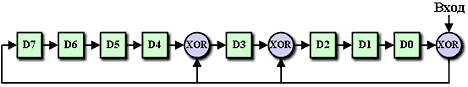 После приема данных мастер должен вычислить контрольную сумму и сравнить получившееся значение с переданной CRC. Если эти значения совпадают, значит, прием данных прошел без ошибок. Можно также вычислить контрольную сумму для всех 64 принятых бит, которая в этом случае должна быть равна нулю. Блок-схема алгоритма вычисления контрольной суммы показана на рис. 8. Алгоритм использует операции сдвига и «исключающего или». Квадратиками показаны биты переменной, которая используется для вычисления CRC. Перед вычислением её необходимо обнулить, а затем на вход алгоритма нужно последовательно подать 56 принятых бит в том порядке, в котором они были приняты. В результате переменная будет содержать значение CRC.