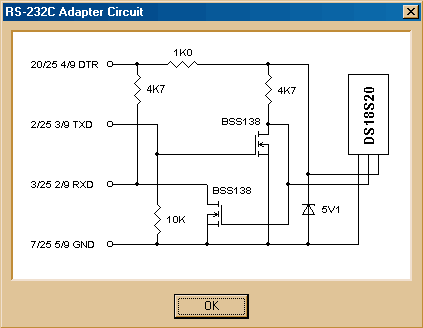 Для подключения DS18S20 к COM-порту компьютера используется адаптер, схема которого приведена на рисунке, где показано окно помощи программы.