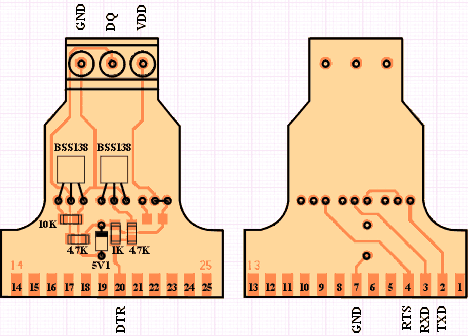 Схема этого адаптера не так проста, как, например, схема адаптера DS9097 фирмы Dallas. Это связано в первую очередь с тем, что хотелось иметь общую «землю» компьютера и 1-проводной шины. Для питания DS18S20 используется линия DTR последовательного порта. Адаптер обеспечивает на входе RXD порта компьютера лишь однополярные уровни, что, строго говоря, не соответствует спецификации RS-232C. Однако большинство портов с такими уровнями работают нормально. Вместо указанных на схеме n-канальных МОП-транзисторов можно применить близкие по параметрам транзисторы других типов, например, 2N7000. Подойдут также отечественные транзисторы КП501 или КП505. В принципе, можно применить и биполярные транзисторы, добавив в базы ограничительные резисторы. Конструктивно адаптер выполнен в корпусе разъема D-SUB-25 :