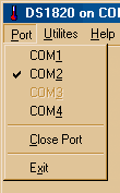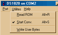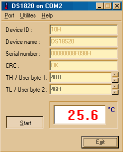 Программа ds1820.exe, работающая под Win95/98/ME/NT, позволяет считывать и отображать показания термометра, а также считывать серийный номер и программировать два пользовательских байта. Эта программа кроме термометра DS18S20 поддерживает и его предшественника DS1820.