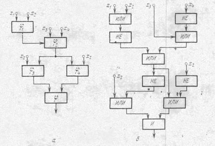 При синтезе относительно несложных функциональных схем последние непосредственно составляются из ЭФП. При синтезе логических схем со множеством входов и одним выходом придерживаются следующих правил: а) выбирается так называемый базис или система ЛЭФП (чаще всего схемы И, ИЛИ, НЕ), из которых будет синтезироваться интегральная схема; б) алгоритм работы схемы описывается известными законами математической логики через соотношения, определяемые выбранными ЛЭФП; в) общее выражение алгоритма разбивают на ряд менее сложных взаимосвязанных между собой частных функций; г) на основе выбранной системы частных функций строят логическую схему.