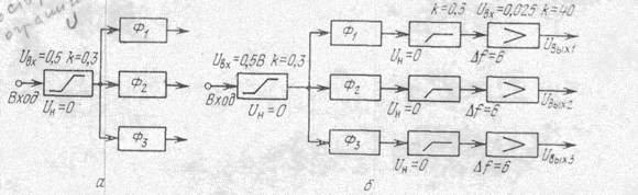 Алгоритм работы схемы. Первая основная задача алгоритма: выделить из высокочастотного ЧИМ/АМ сигнала импульсы посылки и разделить их по трем каналам. Вторая основная задача: обеспечить заданные параметры выходных сигналов. Реализация первой основной задачи приведена на рис. 4, а. Полная функциональная схема распределителя сигналов приведена на рис. 4, б. В схеме используется десять АЭФП трех типов: ограничения, фильтрации и усиления.