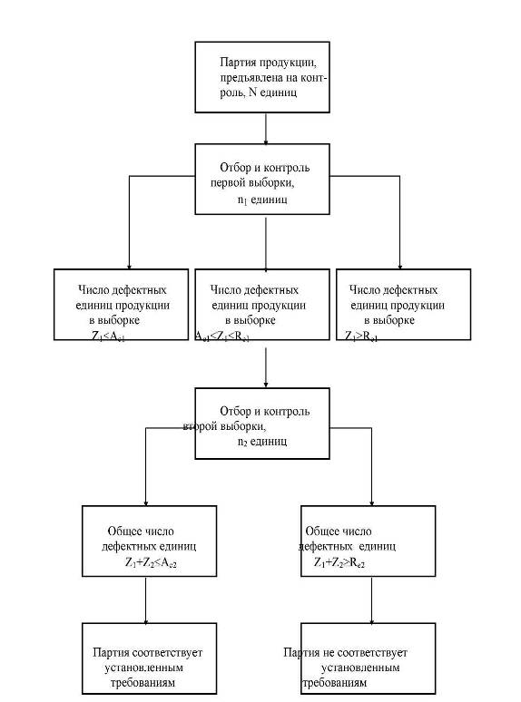 Двухступенчатый план выборочного контроля характеризуется тем, что решение относительно приемки партии продукции принимают по результатам контроля не более двух выборок, причем необходимость отбора второй выборки зависит от результатов контроля первой выборки.