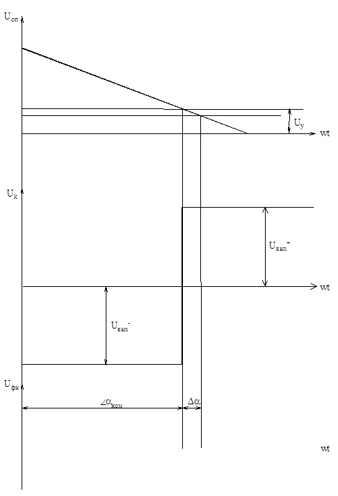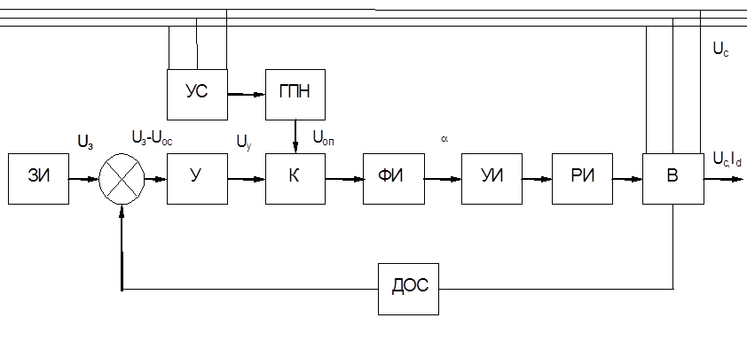 Напряжение с нагрузки Ud через датчик Д поступает на элемент сравнения. Также на вход элемента сравнения подаётся напряжение Uз с задатчика интенсивности ЗИ. Разница напряжений (Uз -Uос ) поступает на усилитель У и усиленное напряжение управления Uу идёт на компаратор К. На другой вход компаратора подаётся опорное напряжение Uоп с генератора пилообразного напряжения ГПН, управляемого устройством синхронизации УС, подключенного к линиям сетевого напряжения Uс . Пока опорное напряжение больше напряжения управления на выходе компаратора присутствует отрицательное выходное напряжение Uвых - . По достижению равенства входных напряжений компаратора он опрокидывается и на формирователе импульсов Ф оказывается положительное напряжение Uвых + .