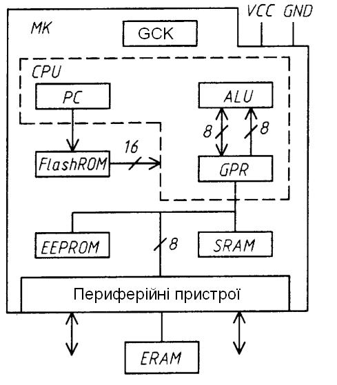 Мікроконтролери сімейства AVR мають єдину базову структуру. Узагальнена структурна схема мікроконтролера (МК) зображена на рисунку 1.
