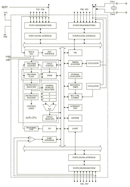 ATMega-8 - 8-розрядний КМОП мікроконтролер заснований на архітектурі Atmel AVR. Контролер виконує більшість інструкцій за 1 такт, тому обчислювальна потужність контролера рівна 1MIPS на 1 Мгц. Блок схема процесора показана на рисунку 4.