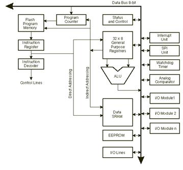 Мікроконтролер має RISC – архітектуру, але формат команди двооперандний, за один такт може бути звернення тільки до двох регістрів. Контролер містить 32 регістри, які можуть рівноправно використовуватися в арифметичних операціях.