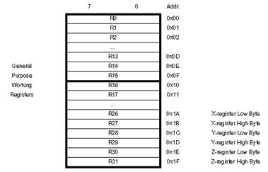 Старші 6 8-ми бітових регістрів утворюють 3 регістрові пари, які використовуються для адресації пам'яті - X,Y,Z.