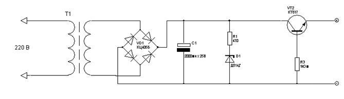 Для того щоб спаяти схему блока нам знадобляться елементи, які зображенні на рисунку 8. Перш за все, знадобиться трансформатор з напругою на вторинній обмотці 11 – 13 V та струмом навантаження неменше 1 ампера (він позначений на схемі Т1). Також знадобиться діодний міст VD1 з максимальним струмом 1 ампер. Далі – С1 – електричний конденсатор, яким будемо фільтрувати та згладжувати вирівняний діодним містом напругу, його параметр зображено в таблиці 1. D1 – стабілітрон – від відповідає за стабілізацію напруги, для того щоб при зміні напруги в мережі, змінювалася напруга і в самій схемі. При створенні схеми обрано стабілітрон Д814Д але й можливо обрати будь-який інший з напругою стабілізації 13 вольт. Також нам знадобиться постійний резистор R1,а також два транзистори – КТ 315 з будь-якою літерою в назві та КТ 817 також з будь-якою літерою. Всі елементи зображені в таблиці 1.