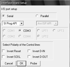 В цьому вікні необхідно обрати порт, до якого підключений наш програматор. Крім того, в цьому вікні можна проінвертувати будь-який із керуючих сигналів програматора, що інколи буває корисним при роботі з нестандартними схемами. Обираємо послідовний порт (Serial). Якщо комп’ютер має декілька COM – портів, слід оберати конкретний порт (зазвичай СОМ1). В спадаючому списку необхідно обрати спосіб програмування. В даному випадку це послідовне програмування по ISP– інтерфейсу. Якщо в комп’ютері тільки один послідовний порт СОМ1, тоді всі налаштування повинні виглядати так, як зображено на рисунку 11.