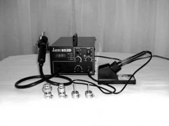 Для ремонту таких плат або виготовлення власних схем по такій технології застосовують так звані "Термоповітряні паяльні станції". Принцип роботи такого паяльника аналогічний роботі звичайного фена для сушіння волосся. Різниця лише в температурі повітря який виходить з кінця фена. Такі паяльні станції дозволяють регулювати температуру повітря на виході від 100 до 450 – 500о С, також є можливість регулювання потоку повітря. Зараз отримали розповсюдження комбіновані паяльні станції, де в одному корпусі розміщується як термоповітряний паяльник так і звичайний який зображений на рисунку 18. Такий паяльний пристрій дозволяє проводити ремонт практично будь-якої електронної схеми з будь-яким типом використовуваних елементів. Ціни також достатньо доступні. Таку паяльну станцію початкового рівня можна придбати від 800 до 2000 гривнів.