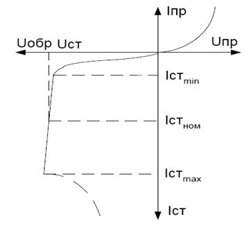Діод Зенера (стабілітрон) – різновид діодів, що дозволяє в режимі прямих напруг пропускати стандартний струм як номінальний діод, а при обернених напругах струм різко зростає (рис. 19) тільки в області напруг близьких до пробою.