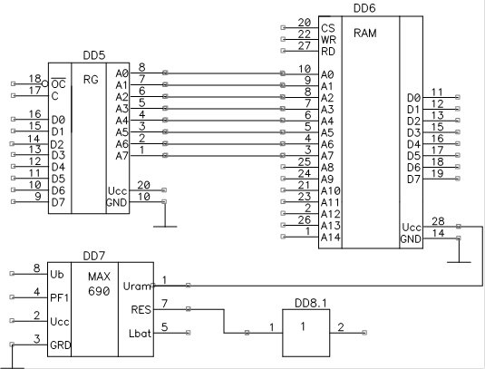 Выходные драйверы портов Р0 и Р2, а также входной буфер порта Р0 используются при обращении к внешней оперативной памяти данных. При этом через порт Р0 в режиме временного мультиплексирования сначала вводится младший байт адреса, а затем выдается или принимается байт данных. Через порт Р2 выводится старший байт адреса, так как разрядность адреса равна 16 бит. Вывод RST предназначен для входа сигнала высокого уровня, после которого в регистры-защелки всех портов автоматически записываются единицы, настраивающие их тем самым на режим ввода.