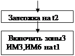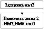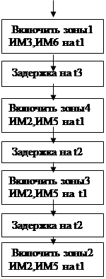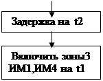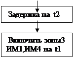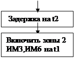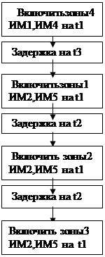 При движении подвижного состава вперед подаются сигналы сначала на зоны1 имитаторов ИМ1 и ИМ4, на зоны2 имитаторов ИМ1 и ИМ4, зоны3 имитаторов ИМ1 и ИМ4, зоны4 имитаторов ИМ1 и ИМ4. Затем подаются сигналы на зоны1 имитаторов ИМ2 и ИМ5, зоны2 имитаторов ИМ2 и ИМ5, зоны3 имитаторов ИМ2 и ИМ5, зоны3 имитаторов ИМ2 и ИМ5, зоны4 имитаторов ИМ2 и ИМ5. Далее сигналы подаются на зоны1 имитаторов ИМ3 и ИМ6, зоны2 имитаторов ИМ3 и ИМ6, зоны3 имитаторов ИМ3 и ИМ6, зоны4 имитаторов ИМ3 и ИМ6. Имитаторы ИМ1, ИМ2, ИМ3 имитируют путевые датчики начала перегона, а имитаторы ИМ4, ИМ5, ИМ6 – путевые датчики конца перегона. Между сигналами каждой зоны необходимо сделать задержку на время t2, а между имитаторами ИМ1 и ИМ4, ИМ2 и ИМ5, ИМ3 и ИМ6 – на время t3.
