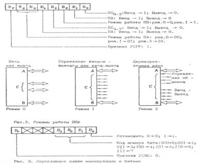 Какпоказанонарис. 2, ППАможетнаходитьсявтрехосновныхрежимах: 0 - основнойрежимввода - выводаинформации; 1 - режимстробируемоговвода-выводаинформации; 2 - режимдвунаправленнойшины.