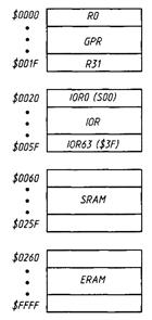 В адресное пространство SRAM кроме адресов, по которым выполняется обращение к ячейкам памяти SRAM, включены 32 адреса для обращения к регистрам общего назначения (адреса от $00 до $1F) и 64 адреса для обращения к регистрам ввода-вывода (адреса от $20 до $5F).