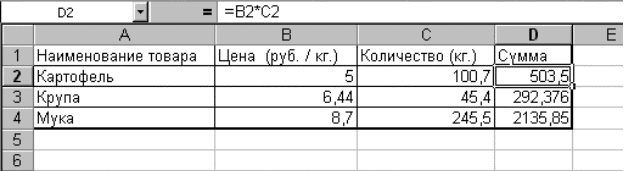 Эту формулу можно прочитать следующим образом: "Значение в ячейке D2 равно значению, хранящемуся в ячейке В2, умноженному на значение в ячейке С2".