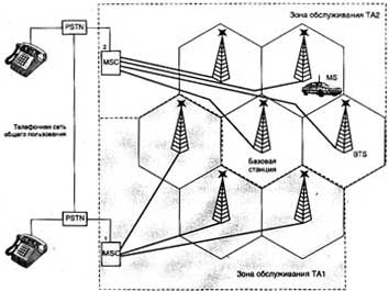 Центр комутації мобільного зв'язку забезпечує керування системою мобільного радіозв'язку і є сполучною ланкою між мобільними станціями і телефонною мережею загального користування. Кожен MSC обслуговує групу базових станцій, сукупність яких утворює його зону обслуговування (на рис. 1.1 зони обслуговування виділені сірим кольором).