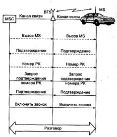 Протокол установлення вхідного виклику в системі NMT побудований у такий спосіб. У початковому стані мобільна станція MS налаштована на частоту канала керування, що має максимальний рівень сигналу. Виклик абонента відбувається центром комутації MSC через усі базові станції BTS, що відносяться до так називаної зони виклику, у якій розташований мобільний абонент у даний момент часу (рис. 1.4).