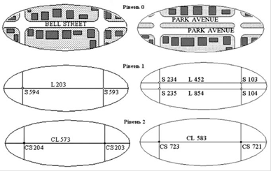 - модель рівня 1 – деталізована сегментно-вузлова модель з дорожніми елементами на рівні осьових ліній ділянок окремих проїздів вулиць (шляхів) для задач "повздовжнього керування";