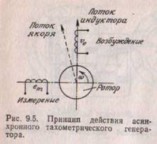 Разность фаз <р меняется на несколько градусов во всем диапазоне изменения скоростей генератора, но испытывает скачок на я при смене направления вращения. При нулевой скорости на клеммах измерительной обмотки возникает небольшое остаточное напряжение; оно вызвано несовершенством конструкции — асимметрией ротора, неоднородностью магнитного контура, неточной установкой обмоток по углу.