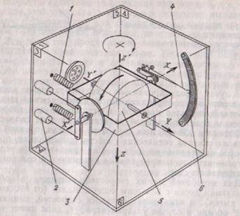 1 — пружина; 2 — амортизатор; 3 —карданов подвес; 4 — курсор; 5 — ротор; 6 — потенцвомегр.