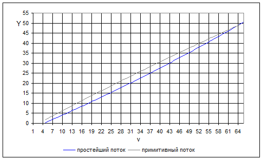 Характер зависимости величины поступающей нагрузки Y от емкости пучка линий, который обслуживает вызовы примитивного потока, поступающие от фиксированного числа источников n такой же, как и при обслуживании вызовов простейшего потока. Однако на пропускную способность пучка влияет число источников вызовов n: в области малых потерь с уменьшением n увеличивается пропускная способность пучка. Из выше приведенного графика видно, что при данном качестве обслуживания поступающая на v линий пучка нагрузка создаваемого вызовами примитивного потока от любого числа источников имеет большую величину по сравнению с нагрузкой Y, создаваемой вызовами простейшего потока.