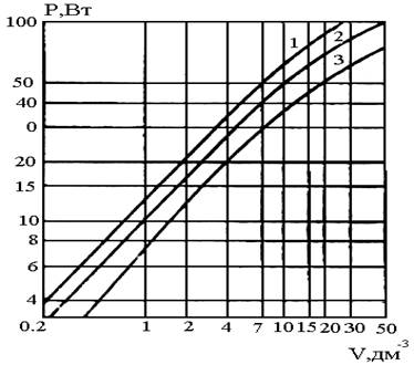 При этом считается, что габариты и объём блока V известны. Рассчитав тепловую характеристику конструкции при заданных V и tc и известных видах теплопередачи, можно варьируя объёмом получить их семейство и полученные зависимости перестроить в зависимости вида (Р, Q) = ƒ3 (V), имеющие практический интерес при конструировании. На рис.1 приведены ориентировочные зависимости допустимой мощности рассеивания блока МЭА при tс=20…60 0С и перегреве корпуса относительно среды 20 0С от объёма корпуса и условий теплопередачи. Корпус блока принят металлическим из алюминиевых сплавов без оребрения. Кривая 1 соответствует случаю излучения и естественной конвекции, кривая 2- излучению и принудительной конвекции воздуха вокруг корпуса (В=0,1м/с), кривая 3- только излучения.