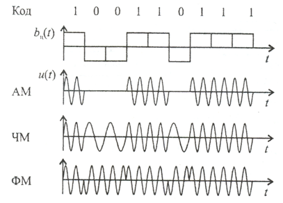 Рисунок 1 - Формы сигналов при двоичном коде для различных видов дискретной модуляции