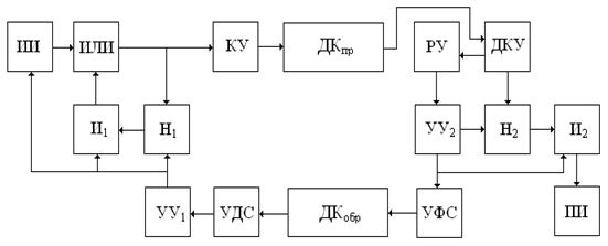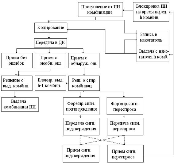 Система с решающей обратной связью, непрерывной передачей и блокировкой приемника строят таким образом, что после обнаружения ошибки приемник стирает комбинацию с ошибкой и блокируется на h комбинаций (т. е. не принимает h последующих комбинаций), а передатчик по сигналу переспроса повторяет h комбинаций (комбинацию с ошибкой и h-1комбинаций, следующих за ней). Эти системы позволяют организовать непрерывную передачу кодовых комбинаций с сохранением порядка их следования. Поэтому одновременно с формированием сигнала переспроса УУ приемной стороны блокирует (т. е. запрещает) вывод информации потребителю из Нпр на время, равное h комбинациям. Получив сигнал переспроса по обратному каналу, УУ приемной стороны ожидает конца передачи последней комбинации, во время которой получен этот сигнал. Затем ИС блокируется также на время передачи h комбинаций, а из Нпер в это время в канал через кодер передаются хранящиеся в накопителе последние h комбинаций. После их передачи ИС опять получает разрешение на передачу очередных комбинаций. Таким образом, последовательность передаваемых и принимаемых комбинаций не нарушается.
