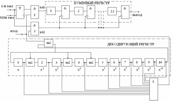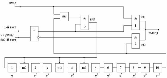 Деление осуществляется многотактным фильтром с числом ячеек, равным числу проверочных разрядов (степени порождающего полинома). В рассматриваемом случае число ячеек r=10. Число сумматоров в устройстве равно числу ненулевых членов g(х) минус единица. В данном случае число сумматоров равно четырем. Сумматоры устанавливаются после ячеек, соответствующих ненулевым членам g(х). Поскольку все неприводимые полиномы имеют член х°=1, то соответствующий этому члену сумматор установлен перед ключом 3 (логической схемой И).
