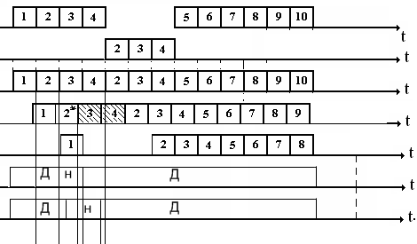 Для основного и обходного канала передачи данных рассчитаны основные характеристики (распределение вероятности возникновения хотя бы одной ошибки на длине n, распределение вероятности возникновения ошибок кратности t и более на длине n, скорость кода, избыточность кода, вероятность обнаружения кодом ошибки и др.). В данной работе построена временная диаграмма, соответствующая работе системы РОСнпбл .