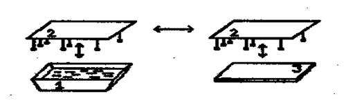 Метод группового переноса капель адгезива заключается в одновременном нанесении адгезива на все точки поверхности платы соблюдая нужную толщину слоя. Специальный держатель с определенно установленными иголками опускается в емкость с адгезивом, уровень которого должен быть постоянным. В зависимости от диаметра иголок забирается некоторое количество адгезива (рис.2). Далее держатель приподнимается и совмещается с печатной платой. При касании платы на ее поверхности в соответствии с топологией остаются капли адгезива. Адгезив должен обладать точно определелённой и постоянной вязкостью, поэтому к нему предъявляются повышенные требования и не все типы адгезивов им удовлетворяют. Необходимо иметь ввиду, что при таком способе объем капли может увеличиваться из-за «обрастания» иголки остатками адгезива. Поэтому необходима постоянная очистка оснастки.
