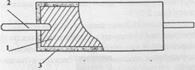 На рис показана конструкция объемного резистора, представляющего собой стержень 1 из токопроводящей композиции круглого или прямоугольного сечения с запрессованными проволочными выводами 2. Снаружи стержень защищен стеклоэмалевой или стеклокерамической оболочкой 3. Сопротивление такого резистора определяется соотношением