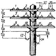 На траверсах укрепляются стальные штыри с размерами, соответствующими типу траверс (деревянные или стальные), и изоляторы.