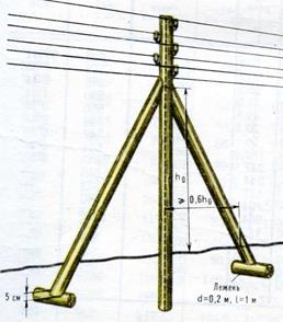Опоры. Опоры воздушных линий связи должны обладать достаточной механической прочностью, сравнительно продолжительным сроком службы, быть относительно легкими, транспортабельными и экономичными. До последнего времени на воздушных линиях связи применялись опоры из деревянных столбов. Затем начали широко применяться железобетонные опоры.