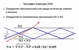 4. Числовая апертура - Показатель, характеризующий способность оптического волокна захватывать падающий световой поток. Определяется как максимальный угол, при котором для вводимого в волокно светового излучения обеспечивается полное внутреннее отражение.