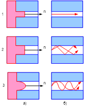 Рис. 3 Волоконные световоды: а) эпюра показателя преломления; б) прохождение луча: 1 – одномодовые; 2 – многомодовые; 3 – градиентные