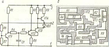 Рисунок 4. Электрическая принципиальная схема (а) и эскиз топологии (б) тактового генератора в толстопленочном исполнении.