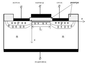 Основными элементами конструкции МДП-транзистора являются:1)- две сильно легированные области противоположного с подложкой типа проводимости, сток и исток ; 2) диэлектрический слой, отделяющий металлический электрод, затвор, от полупроводниковой подложки и лежащий над активной областью транзистора, инверсионным каналом, соединяющим сток и исток.