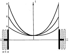 Область равномерного поля тем больше, чем меньше отношение расстояния между электродами к их диаметру. При расположении больного между электродами линии поля в связи с негомогенной структурой нигде не идут равномерно, они искривляются и в средней зоне так, что наибольшая напряженность поля имеется под электродами. В связи с этим при отсутствии или малых воздушных зазорах наибольшее выделение тепла имеет место на поверхности тела и резко спадает с глубиной (рис. 3, а). Для обеспечения более равномерного распределения тепла между поверхностными и глубоко расположенными тканями увеличивают величину зазоров до нескольких сантиметров. При этом, как уже указывалось, наиболее неоднородная часть поля около электродов оказывается вне тела и равномерность воздействия по глубине значительно улучшается (рис. 3, б, в). Для того чтобы при значительных зазорах обеспечить достаточно эффективный нагрев тканей, аппарат для УВЧ-терапии должен обеспечить возможность увеличения напряжения на электродах, так как при увеличении зазоров увеличивается доля приходящегося на них напряжения.