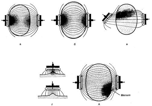 Выбором величины электрода, величины зазора, а также наклона электрода по отношению к поверхности тела можно обеспечивать преимущественное воздействие на определенный участок тела. Если электроды одинаковые, то воздействие более интенсивно со стороны электрода, расположенного с меньшим зазором (рис. 4, а). То же самое имеет место и при использовании одного электрода меньшего размера (рис. 4, б). При установке электрода наклонно к поверхности тела происходит концентрация поля около края электрода, расположенного ближе к телу, в результате чего также имеет место избирательный нагрев (рис. 4, в). Такой способ применяется при нагреве складок тела, например, между щекой и носом.