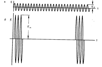 За последние годы в практику физиотерапии входит метод воздействия на организм электрическим полем УВЧ в импульсном режиме, называемый импульсной УВЧ-терапией. При импульсной УВЧ-терапии электрическое поле имеет импульсный характер (рис. 5). Генерация высокочастотных колебаний происходит в течение нескольких микросекунд, после чего следует пауза, в тысячу раз превышающая длительность самого импульса. Напряженность поля между электродами за время действия импульса достигает нескольких тысяч волы на метр, что в 6-7 раз больше, чем при непрерывном режиме. Поскольку мощность колебаний пропорциональна квадрату напряженности поля, то аппараты для импульсной УВЧ-терапии имеют мощность в импульсе до 15000 Вт, что в 40 раз больше мощности, которая может создаваться аппаратами для непрерывной УВЧ-терапии. Средняя мощность импульсных колебаний в тысячу раз меньше, чем мощность в импульсе и не превышает 15 Вт.