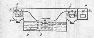 Промывку с помощью ультразвука проводят в специальных ваннах (рис. 1). Ванна 6 заполняется растворами щелочей, кислот или органическими растворителями. В растворы щелочей на 1 л воды входят следующие компоненты в г; сода кальцинированная - 20; тринатринфосфат - 10, силикат натрия - 20, едкий натрий - 5-25 и др. В растворы кислот; на 1 л входят: серная кислота - 100 мл, соляная кислота - 50 мл, хлористый натрий - 60 г, азотная кислота - 100 мл, фтористый калий или кальций - 5-10 г и др.